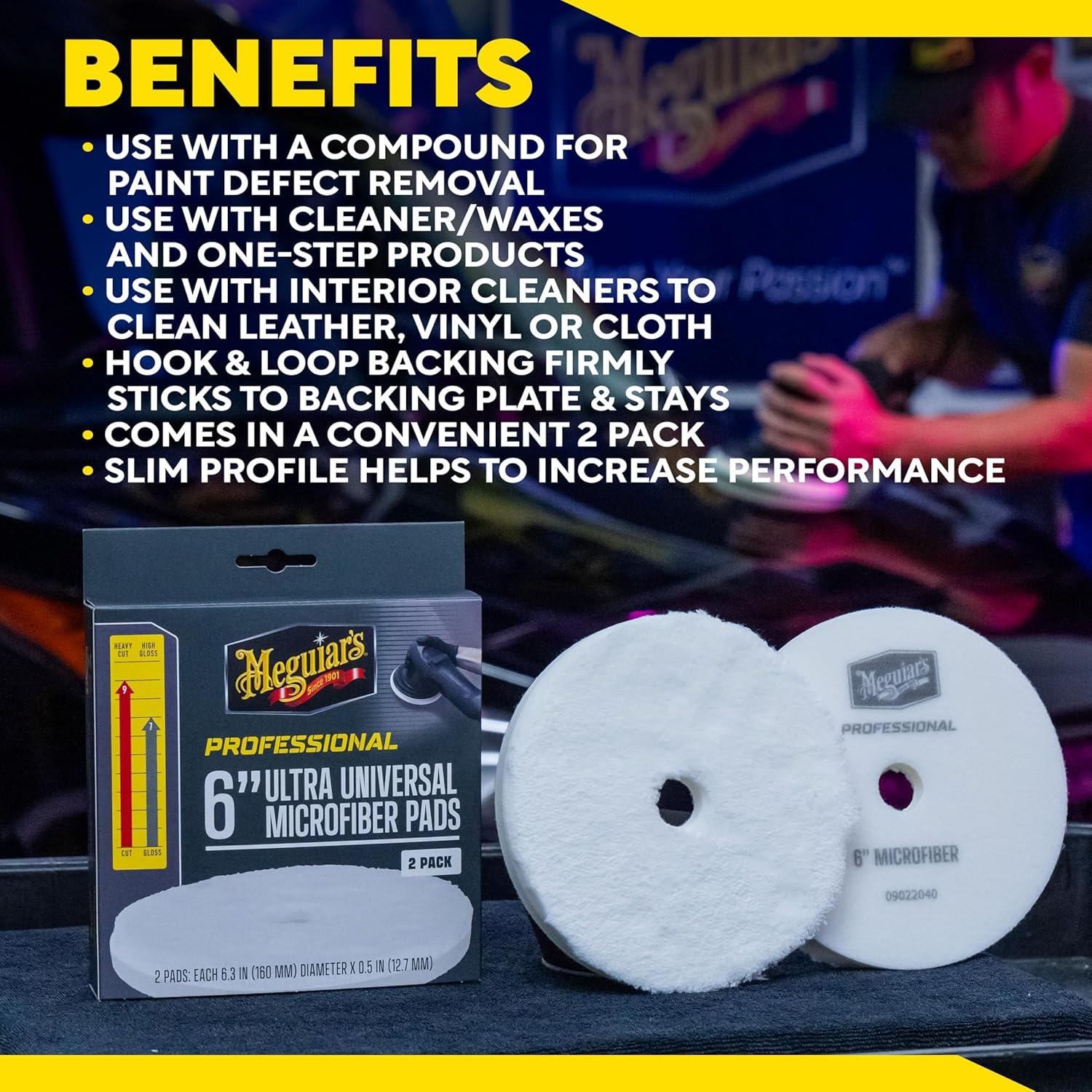 Unlock the true potential of your paint correction process with Meguiar's Professional 6″ Universal Microfiber Pads, available in a convenient 2-pack. Designed to tackle a wide range of surface defects, these cutting discs are the go-to choice for professional detailers and automotive enthusiasts alike. Eliminate unsightly scratches, acid rain marks, swirls, holograms, and other imperfections with the power of Meguiar's cutting-edge microfiber technology. These discs are engineered to swiftly and effectively remove heavy surface defects without creating swirl marks, delivering amazing results. Each professional detailing pad is designed to deliver the results you're looking for and is designed for use on a dual action polisher. These versatile pads can be paired with compounds for heavy defect removal, cleaner waxes, polishes, or all-in-one detailing products for one-step finish refinement, or even with interior cleaners to clean leather, vinyl, or cloth surfaces. Not only do these cutting discs deliver exceptional performance, but they are also designed with sustainability in mind. Each disc is washable and reusable, ensuring long-lasting use and reducing waste. This makes them a cost-effective choice for anyone, whether a detailing enthusiast or a seasoned professional. Take your paint correction to the next level with Meguiar's 6″ Ultra Universal Microfiber Pads. Trust in the brand that has been synonymous with automotive excellence for over a century. Experience the difference and unleash the true potential of your vehicle's paintwork.