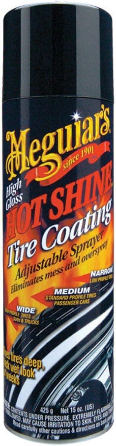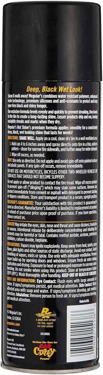 Meguiar's Hot Shine High Gloss formula gives your tires a wet-look with a dark shine. By combining highly water-resistant polymers with anti-ozonant technology, Hot Shine keeps your tires looking black longer while preventing cracking, browning and premature aging.