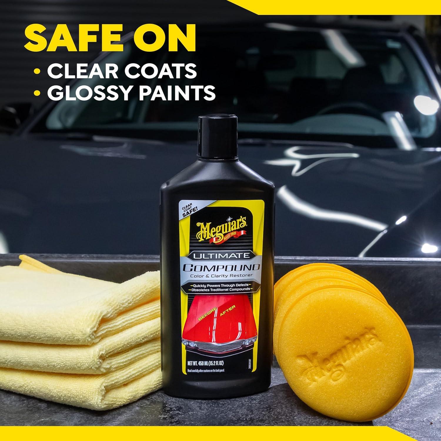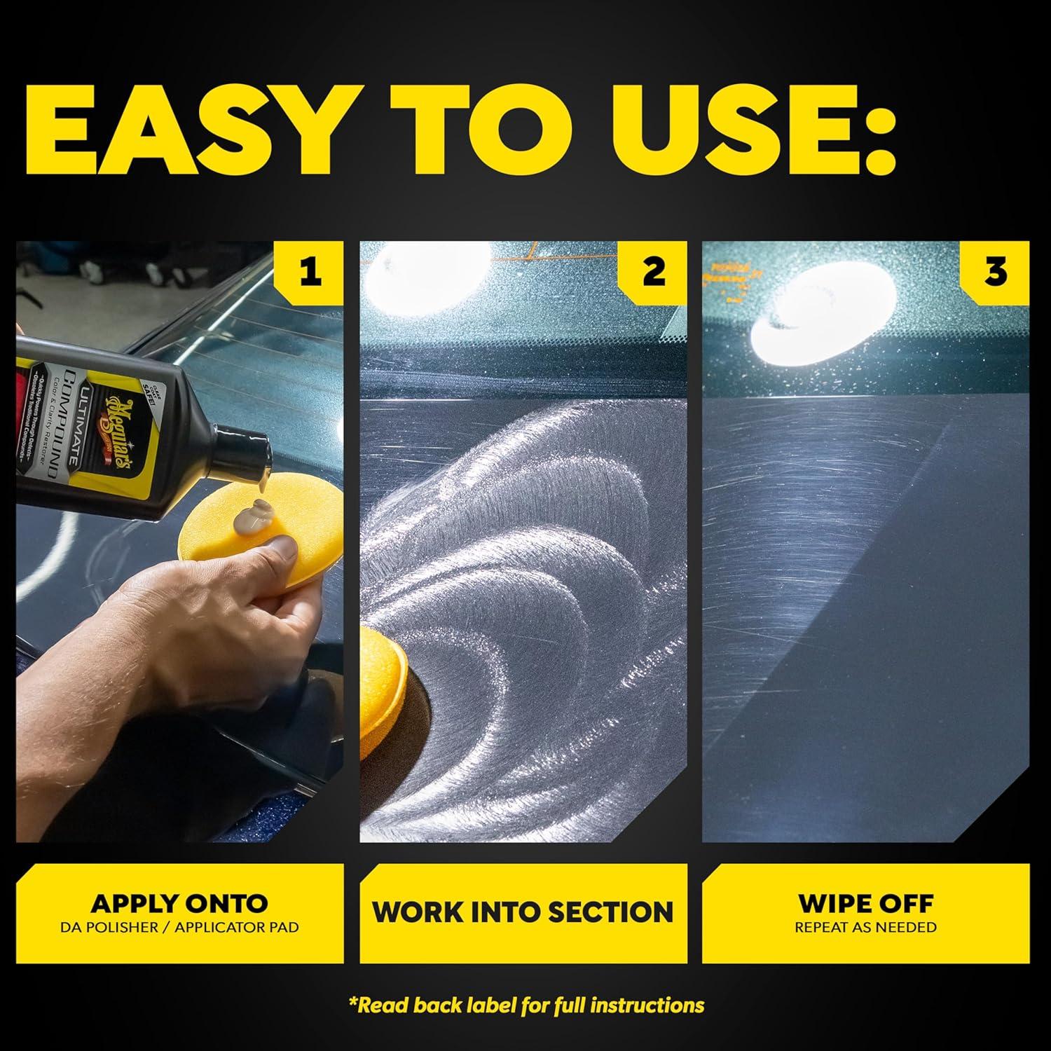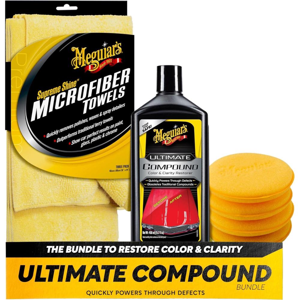 Meguiar's Ultimate Compound 16 oz Bundle includes Supreme Shine 4″ Foam Applicator Pads 4 Pack and Supreme Shine Microfiber Towels 3 Pack for easy and quick restoration of your car’s paint job. This convenient and effective rubbing compound for cars kit enables you to produce professional results right from your driveway. This car buffing compound features our exclusive micro-abrasive technology that we originally developed for body shops and detailers. This means you can get a truly showroom-ready look right at home. Oxidation, scratches, blemishes, and water spots are no match for our professional-grade car rubbing compound. If your vehicle has a neglected or abused finish, Meguiar's Ultimate Compound cuts fast to restore surface clarity without scratching, swirling, or leaving hazy residue behind. Safe and effective for clear coats, you can count on this compound to produce a like-new shine and gloss in one step. To make sure your car restoration is a success, this car buffing compound bundle includes 4 of our 4″ Foam Applicator Pads. This convenient car wash pad is soft and comfortable and makes applying and removing Meguiar's Ultimate Compound fast and easy. Your car care process will be even easier thanks to the inclusion of 3 of our Supreme Shine Microfiber Towels. Designed to be super absorbent, scratch-free, and safe for finishes, this car drying towel will make quick work of washing and restoring any vehicle. With your car buffing compound, foam applicator, and car microfiber towel kit, you’ll have just what you need to get your car looking like new again.