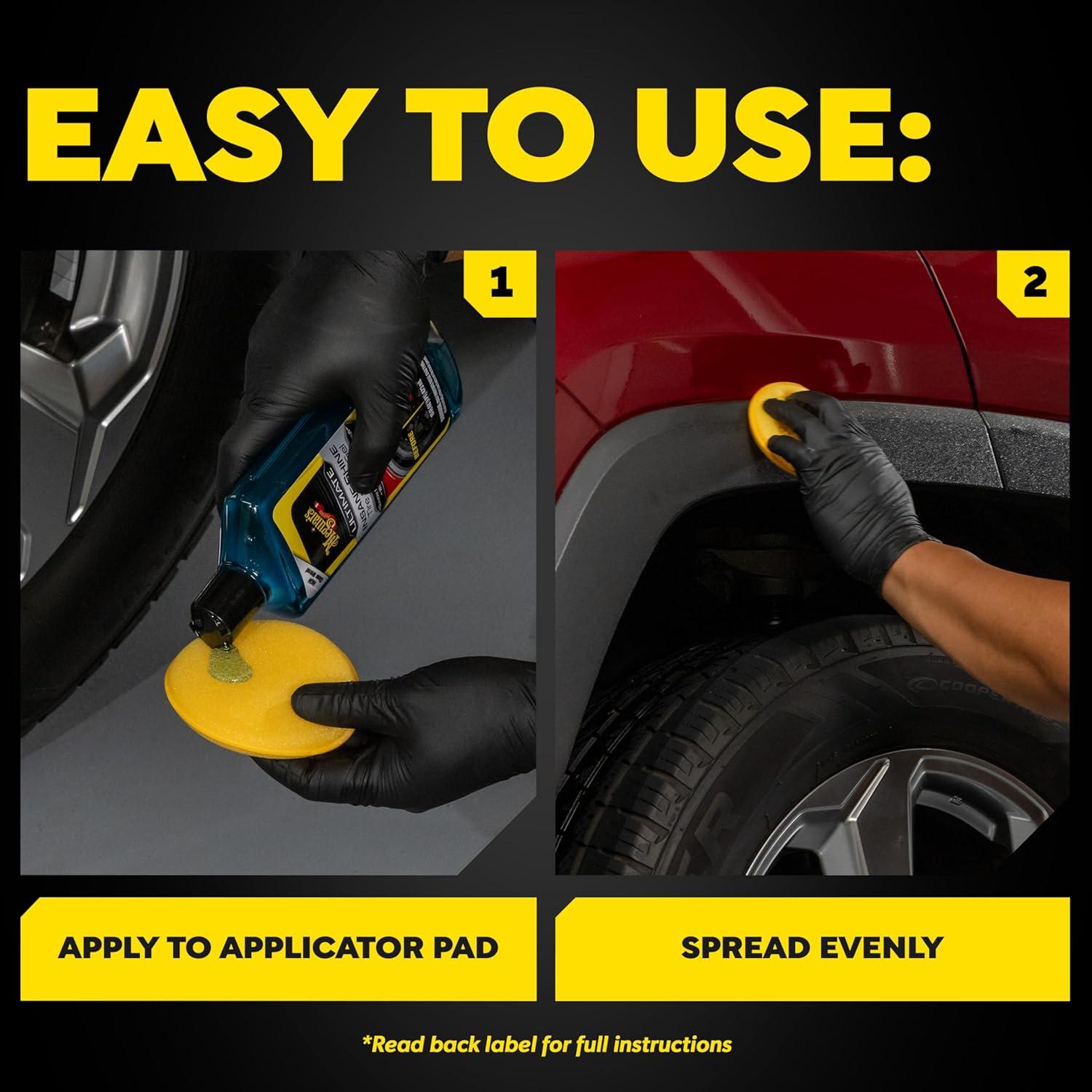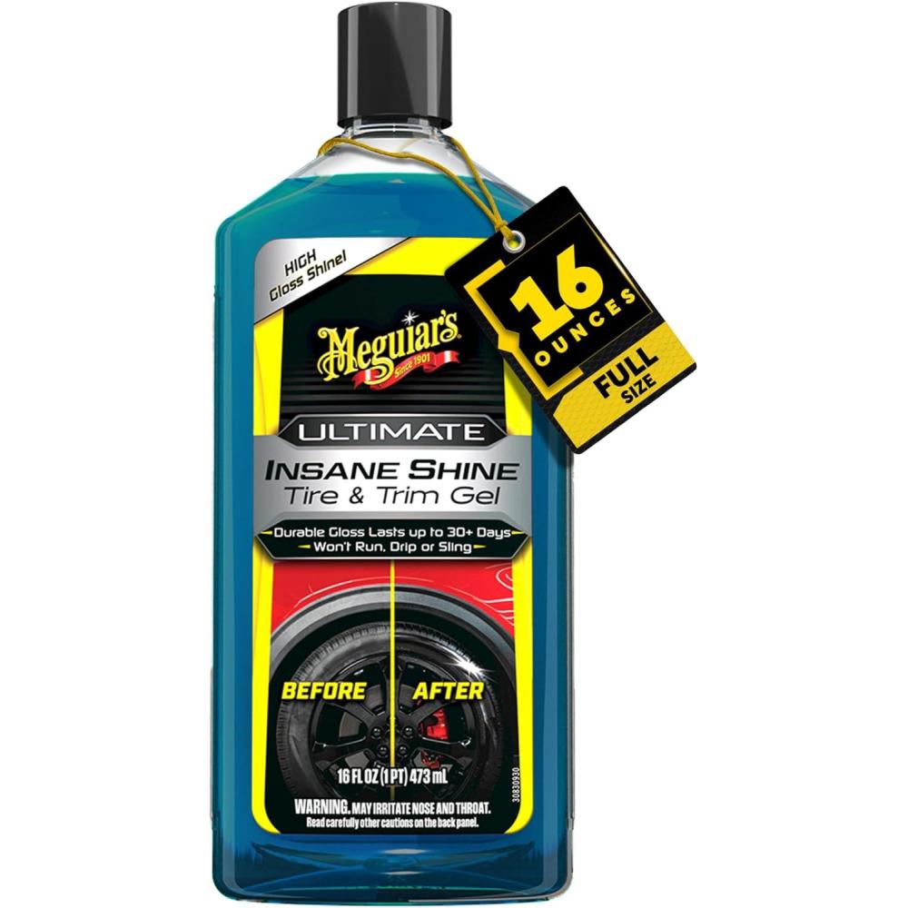 Meguiar’s Ultimate Insane Shine Tire & Trim Gel is an advanced, versatile formula that can be applied exactly where you want it. Apply this tire gel to your tire sidewalls for lasting protection with the durability of a month or more. Enjoy an amazing high gloss shine that will make your tires look their best. Meguiar’s tire shine gel is a unique formula that also shields against UV damage on tires and exterior plastic trim pieces. The ultra-durable, proprietary blend of high-gloss polymers resists rain and frequent washes. Not only do you get shine and protection for your tires, but it can also be applied to exterior plastic trim pieces. On either surface, you get a durable, high-gloss shine that lasts and won’t sling or run. Another benefit of this rich gel formula is that it helps eliminate overspray, runs, and drips. You get full control and a consistent, even shine. Before starting, use a tire cleaner to remove dirt and grime from your tires. When tires are cool, clean, and dry, apply an ample amount of gel to an applicator and spread evenly until the surface is covered. If too much gel is used, wipe off the excess to prevent spin-off. Keep your tires and unpainted plastic trim protected and looking great by adding Meguiar's Ultimate Insane Shine Tire & Trim Gel to your car care routine.